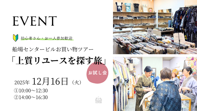 本開催ではこれまでリユース着物目利き講座に参加したことがない方を対象にする予定ですが、このお試し会は過去に目利き講座のツアーにご参加の方もお申し込みいただけます。