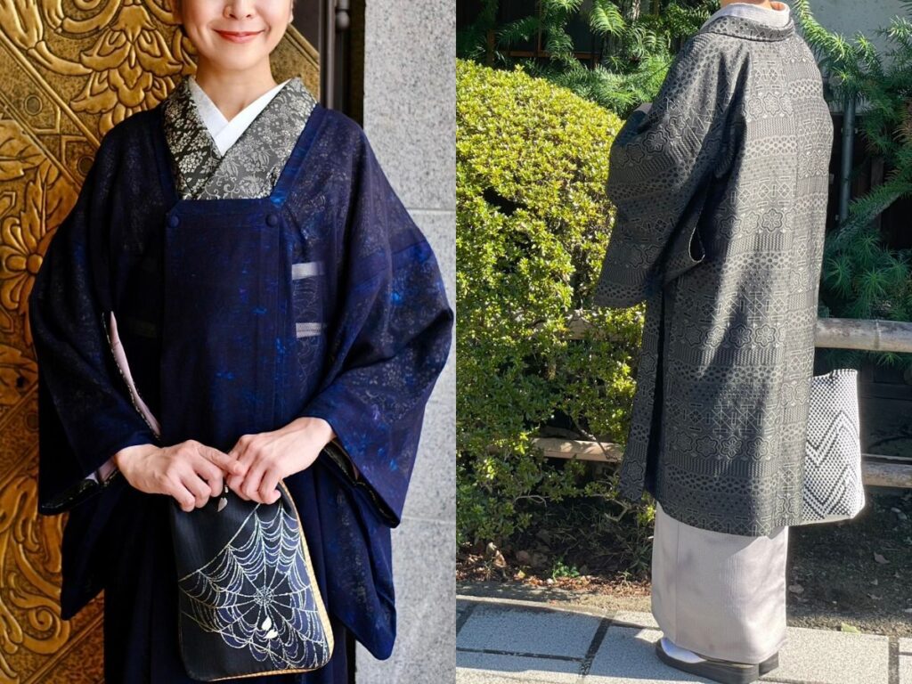 私が着物をはじめた1990年代は、大正ロマンブームもあり、着物売り場では大柄の小紋着尺を使って長めの羽織を作るのが流行っていました。しかしながら同時にそれは、小紋として売りにくいものを羽織マストとして着物ユーザーに押し付けるような売り手側の都合もあったように思います。またオシャレ着として着物を楽しんでいる人にも「春夏秋冬、外出時には必ずアウターを着なければならない」と教える着付け教室もあり、アウターの存在が気軽に着物を着たいという人たちにとっての障壁となっていたのも事実です。